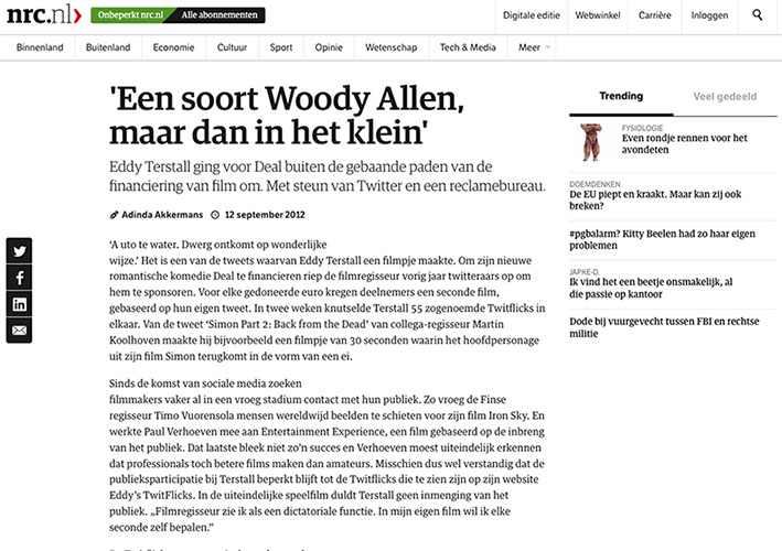 To raise money for Dutch film director Eddy Terstalls new short film. Eddy Terstall wanted to fund his new short film by using the crowdfunding website cinecrowd.nl. It soon became clear that this would not result in the needed budget. Clearly, some rumor was needed to get attention, and some incentive to motivate the audience. We needed a powerful idea that wouldn't cost us any money.